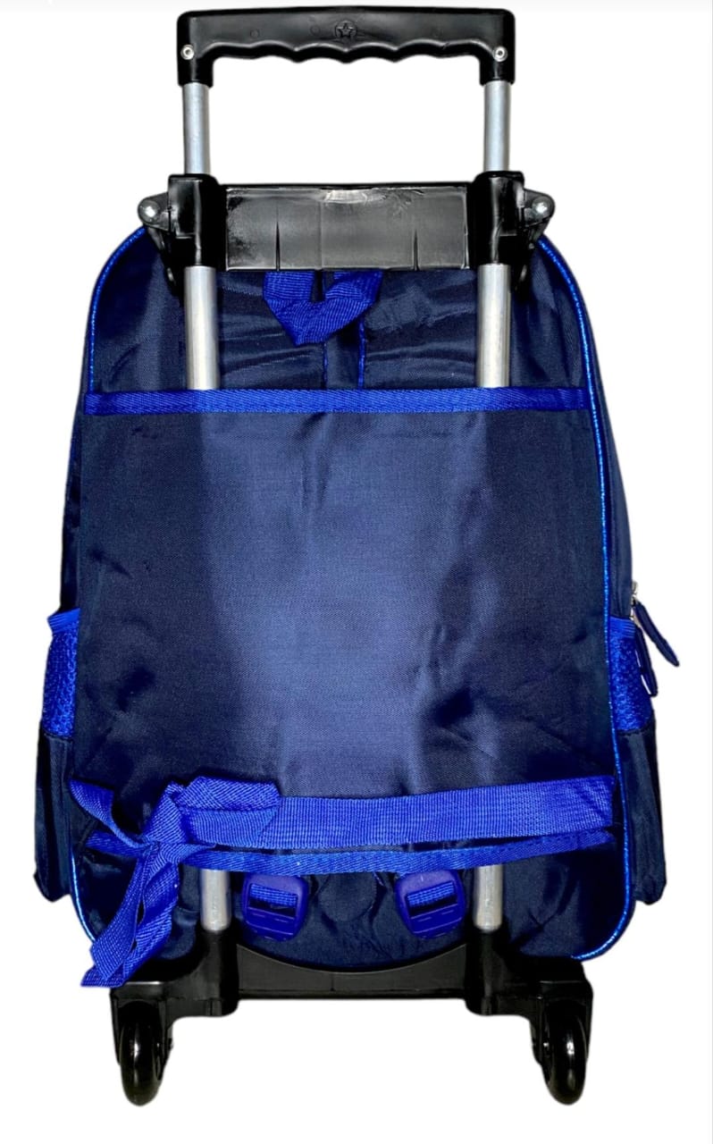 A mochila conta com rodinhas resistentes e alça retrátil, ajudando a criança a levar o material com facilidade sem precisar carregar peso nas costas.
