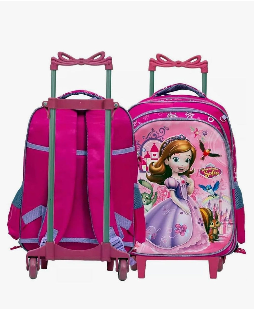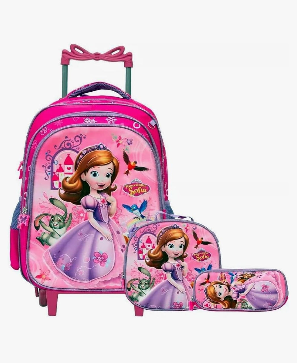 👑 Kit Mochila Escolar Infantil Princesinha Sofia Disney com Rodinhas – 3 Peças